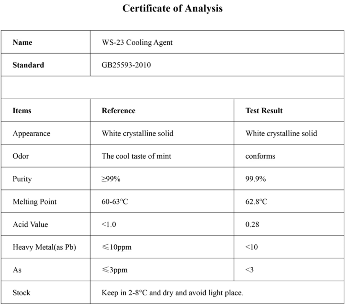 Akora fampangatsiahana tsy dia misy fofona firy ny WS-23. Tsara ho an'ireo izay te-hanana tsiro "mangatsiaka na mangatsiaka" amin'ny fomba fahandro azy ireo, ity dia manolotra tsiro boribory sy malefaka kokoa noho ny akora fampangatsiahana hafa toy ny koolada na menthol. Ny WS-23 dia mazàna tsy manova ny tsiron'ny fomba fahandroanao toy ny ataon'ny akora hafa.